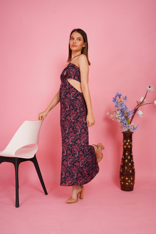 Paisley Cut-out Halter Backless Maxi Dress