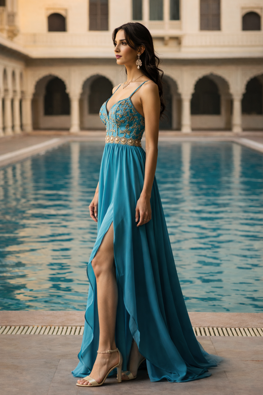 Women’s Teal Blue Embroidered Maxi Dress with Slit | Spaghetti Strap Party & Evening Gown