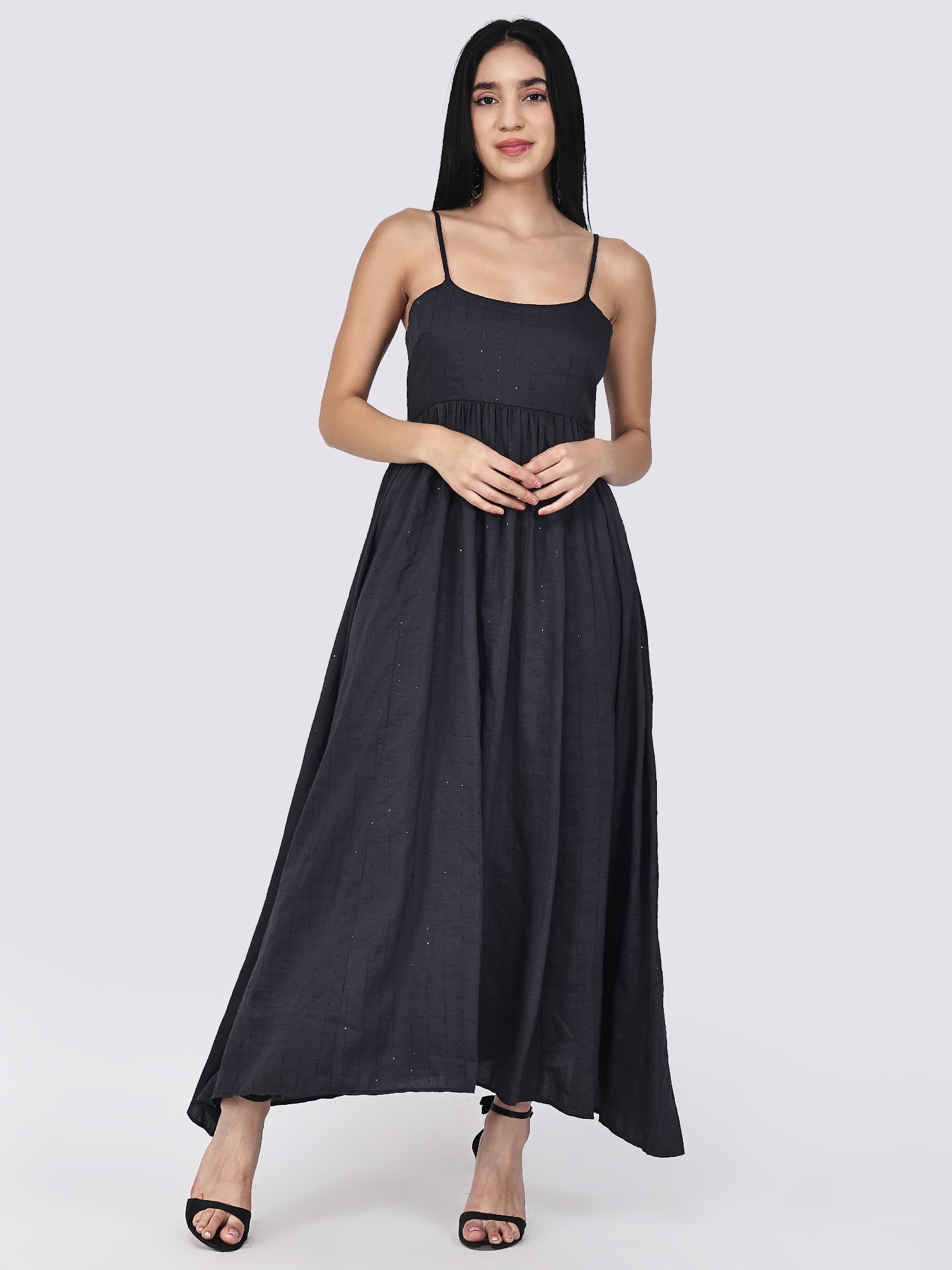 Elevate your style with the Noir Reverie Constellations Maxi Dress. Made from premium Chinon fabric, it glitters and flows beautifully, enhancing your curves. Perfect for both casual and party wear, its vertical sequencing of stars adds a touch of glamour to any occasion. Make heads turn with this must-have dress!