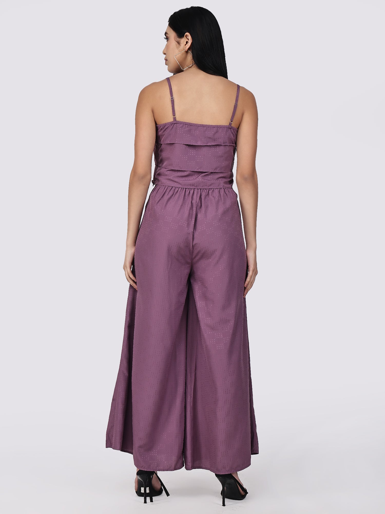 Purple co-ord set is stunning! Frills on top and wide-leg palazzo are bold. Satin viscose fabric is soft