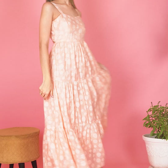 This Peach Polka Dots Maxi Dress is made from delicate premium linen jacquard fabric, giving it a luxurious and high-quality feel. With its timeless polka dot pattern, this dress is suitable for a variety of occasions, from casual wear to office wear to even kitty parties. Elevate your style and make a statement with this versatile and elegant piece.