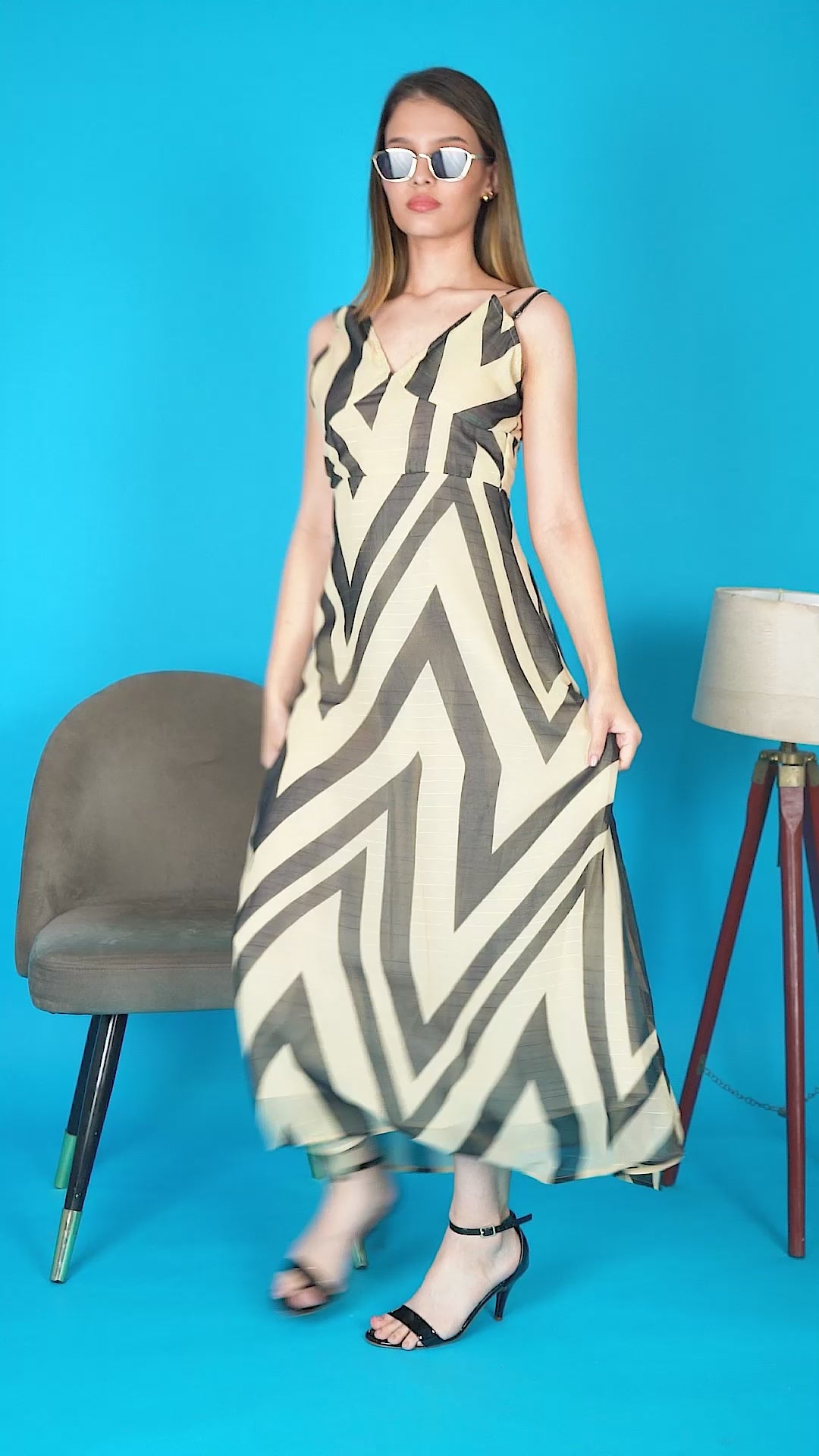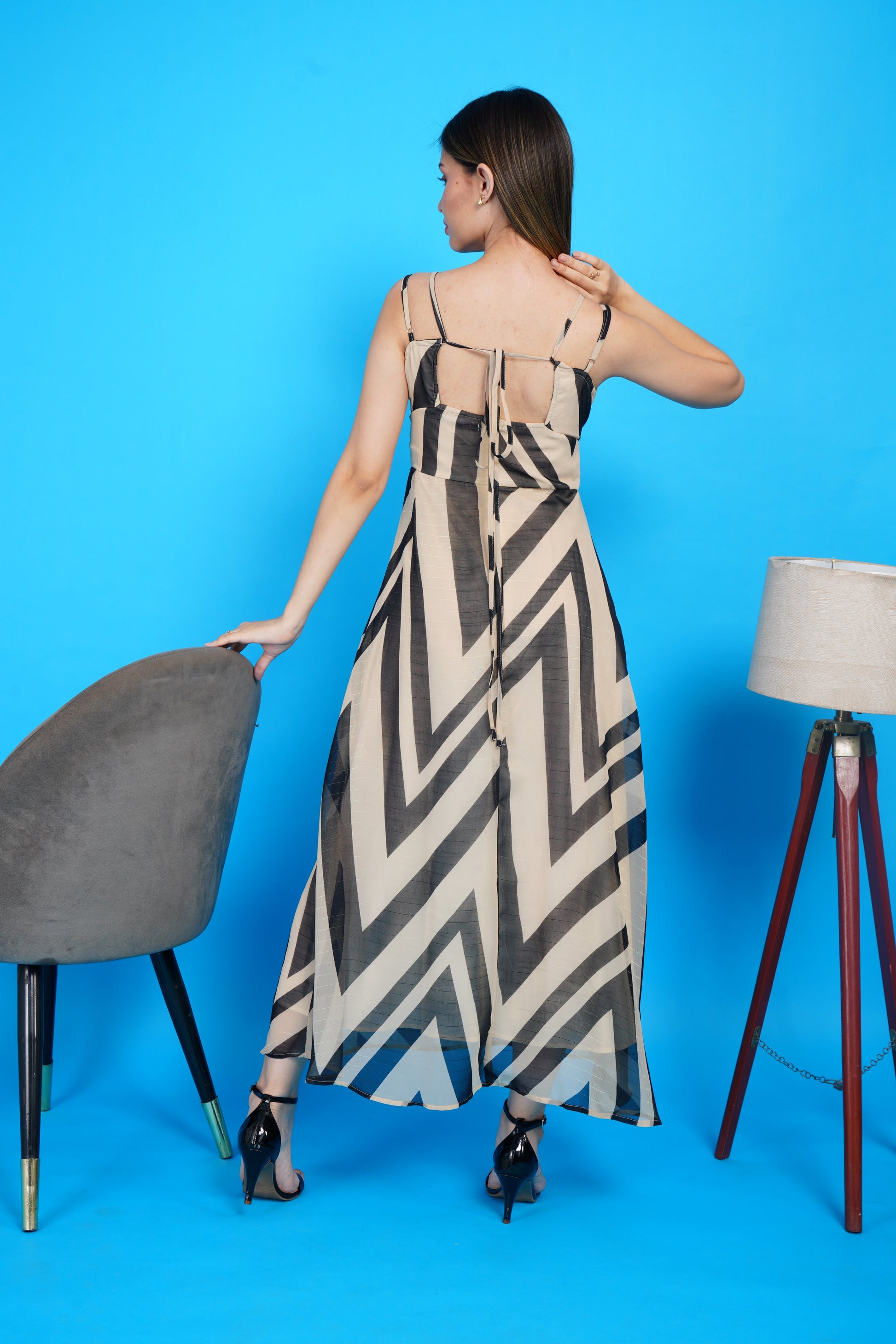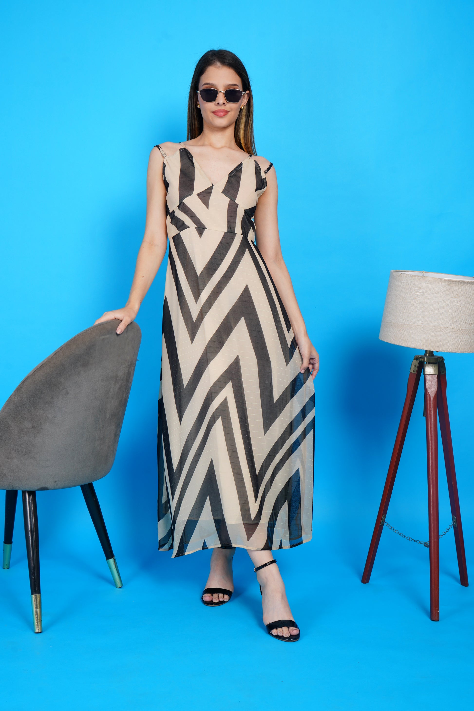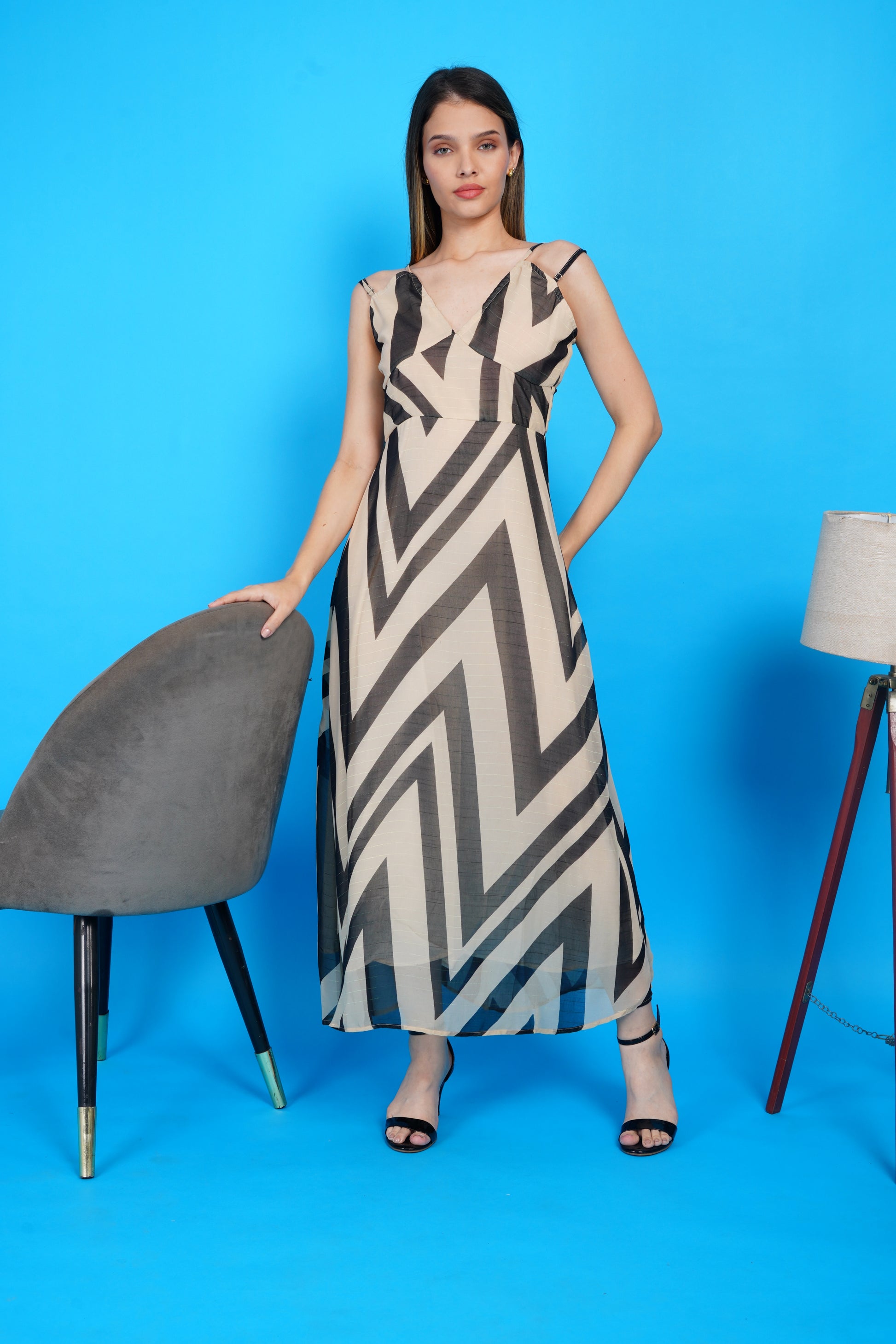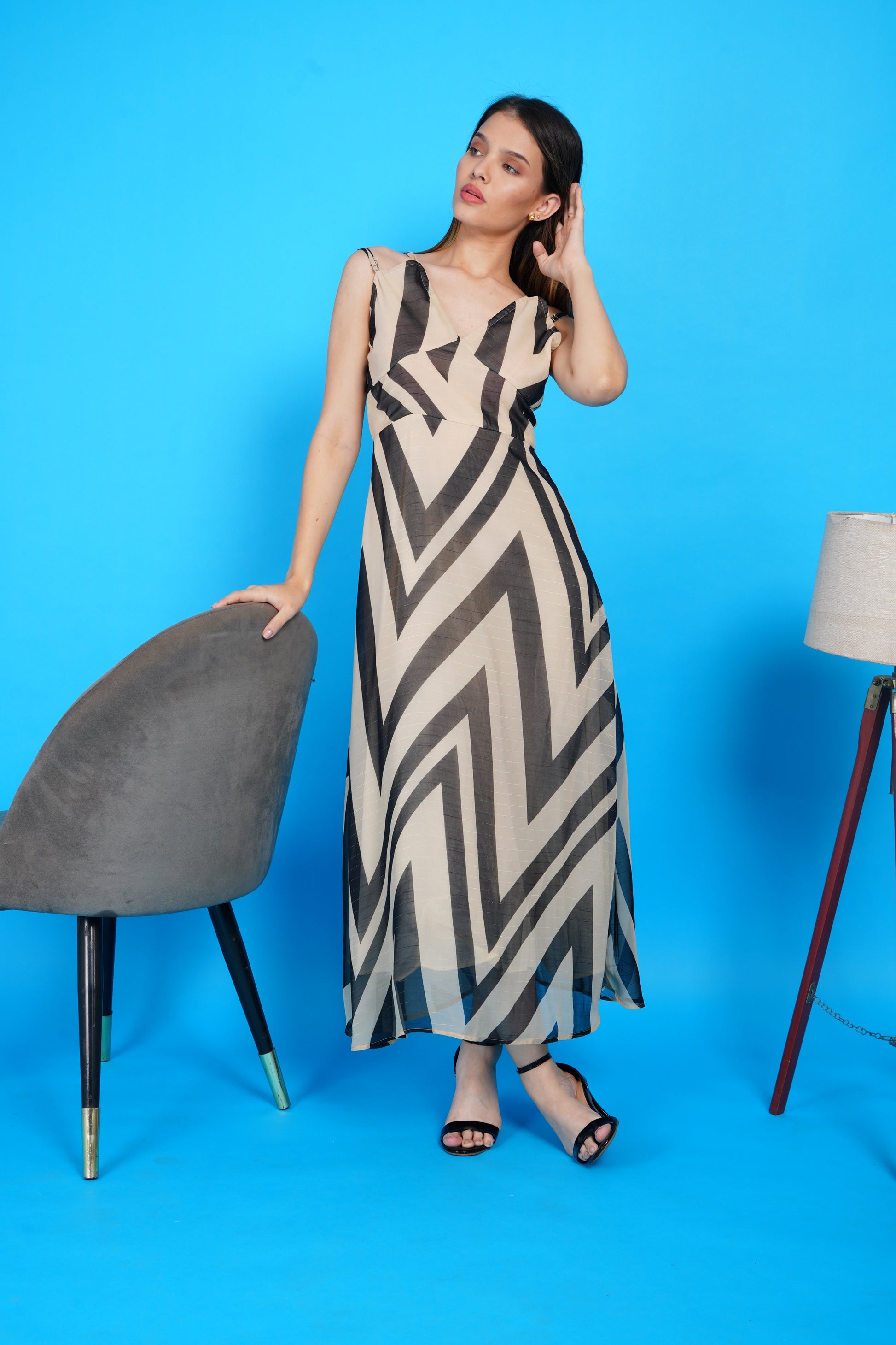 Effortlessly elevate your style with our chic Black Chevron dress. Made from Premium Georgette fabric, it features a unique Judiyak Zari Print and triangular lines for a flattering silhouette. Perfect for any casual occasion, this dress also comes with a comfortable cotton lining. Elevate your wardrobe with this beautiful and versatile maxi dress.